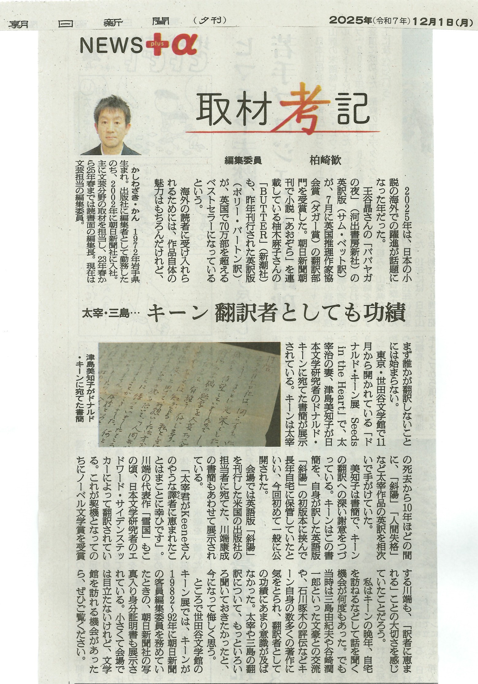 12月1日朝日新聞夕刊に「太宰・三島…キーン 翻訳者としても功績」として晩年のドナルド・キーンの担当記者だった柏崎歓さんが記事を書いてくださいました。そして翻訳者としてのドナルド・キーンに光を当てて下…