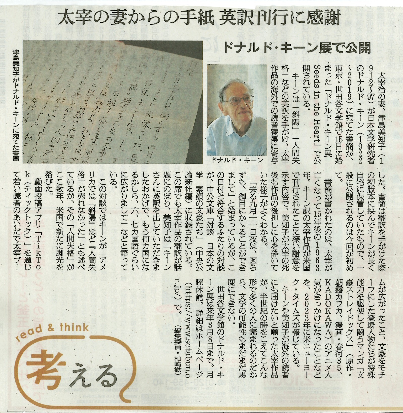 12月19日朝日新聞夕刊に、世田谷文学館のドナルド・キーン展での展示に関連して、「太宰の妻からの手紙 英訳刊行に感謝」と題した記事がありました。 父が翻訳した『斜陽』の初版とそこに父が大切に挟み…