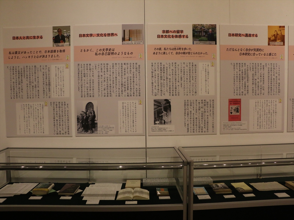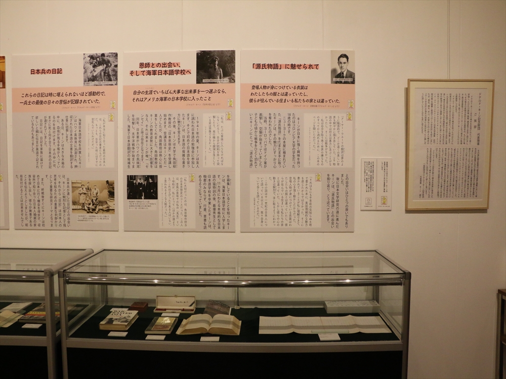 ドナルド・キーンの生涯を少年時代から日本国籍を取得して最晩年まで、大きく7つに分けて写真と説明をパネルで紹介し、それに呼応するようにその下に代表的な著作が並べてあります。