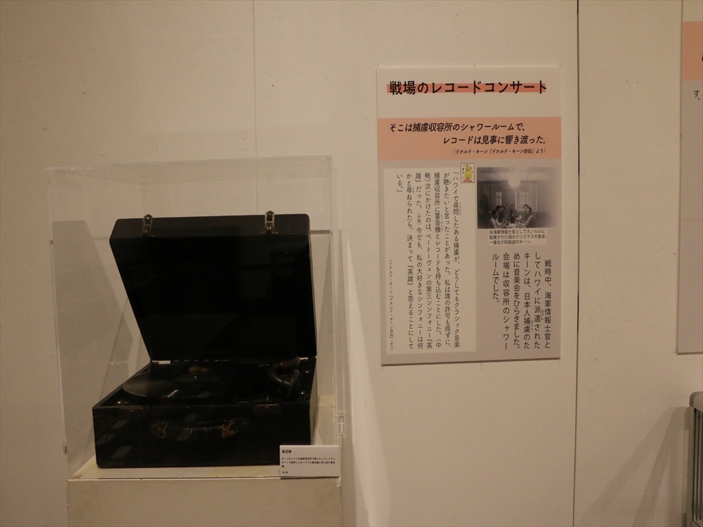 次にハワイの日本人捕虜たちを対象にしてシャワールームで開いた「戦場のレコードコンサート」のことを説明したパネルがあり、その時に実際に使用されたものではありませんが当時の蓄音機とレコードが実際に展示されています。