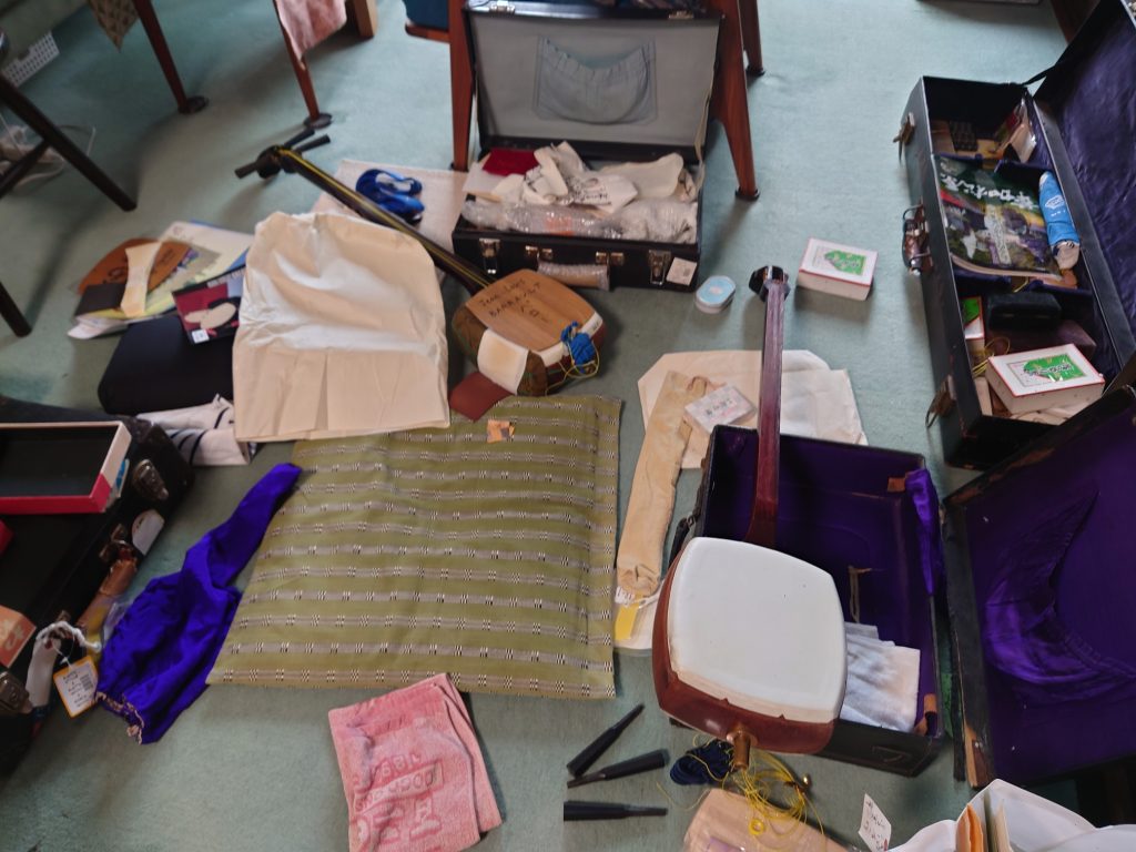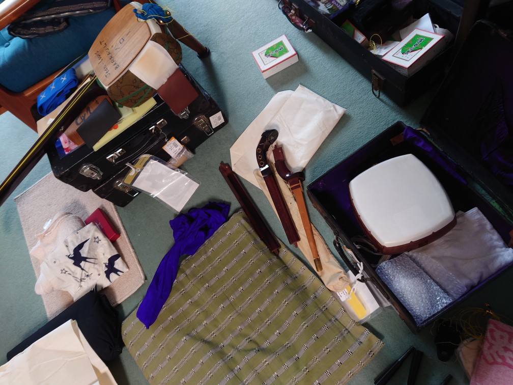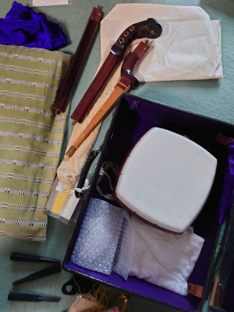 ご覧のように二挺(ちょう)の三味線を継いで(組み立てる、とは言わず継ぐと言います)、手入れして、調弦し皮の張れ具合を確認しました。