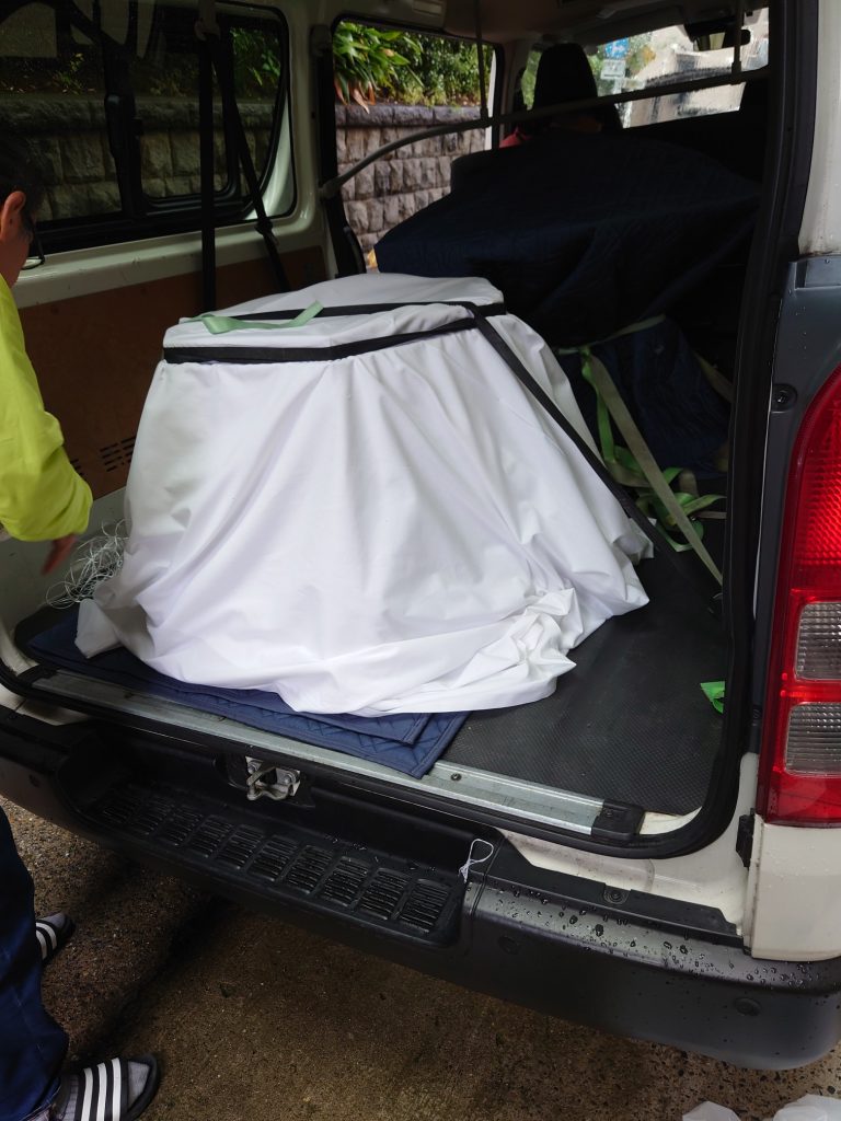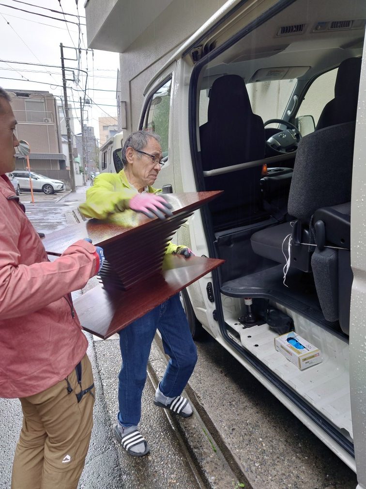 今日は、木下棟梁と息子さんの一久さんが小雨の降る中我が家にこられ、実に丁寧に心をこめて梱包されワゴン車に載せて搬出されました。仏壇をいくつかに分けてひとつひとつワゴン車に積み込みそこで梱包したり動かないように縛ったり、父子おふたりの息はぴったりで見ていて見惚れるほどでした。部屋の戸を外す作業は意外と時間がかかりました。