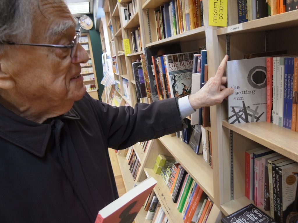 そこの本棚からドナルド・キーンは自ら英訳した『斜陽』(The setting sun)と『人間失格』(No longer human)を偶然に見つけて、写真のようにとても嬉しそうな表情でした。しかしこの頃には、没後数年してThe setting sunが爆発的にヒットするとは思いもしなかったでしょう。