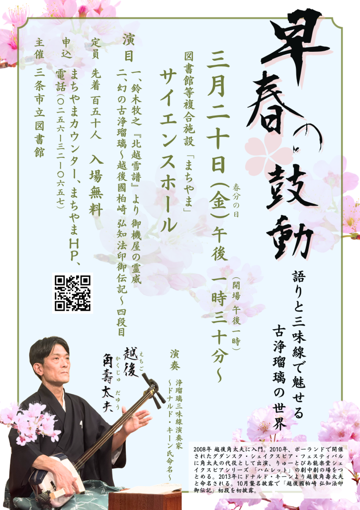 私の弟子の越後角壽太夫が3月20日に三条市立図書館の主催で「早春の鼓動」と題した古浄瑠璃の会を催します。