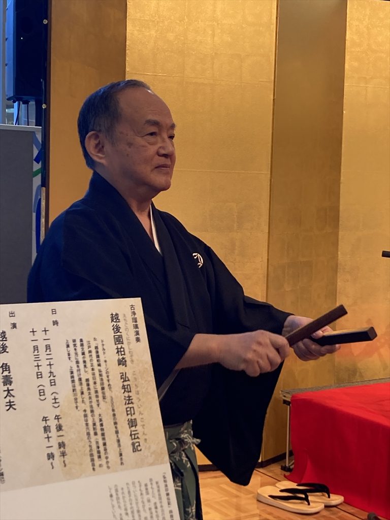 そして私のお話しに続いて私の口上があり、角壽太夫の『弘知法印御伝記』四段目のを弾き語りしました。25分くらいでした。