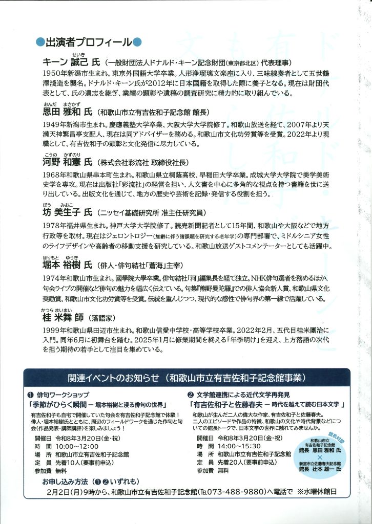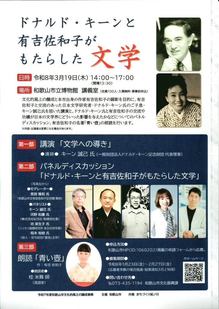 3月19日(木)に和歌山市博物館で「ドナルド・キーンと有吉佐和子がもたらした文学」という興味深いイベントが開催されることになりました。