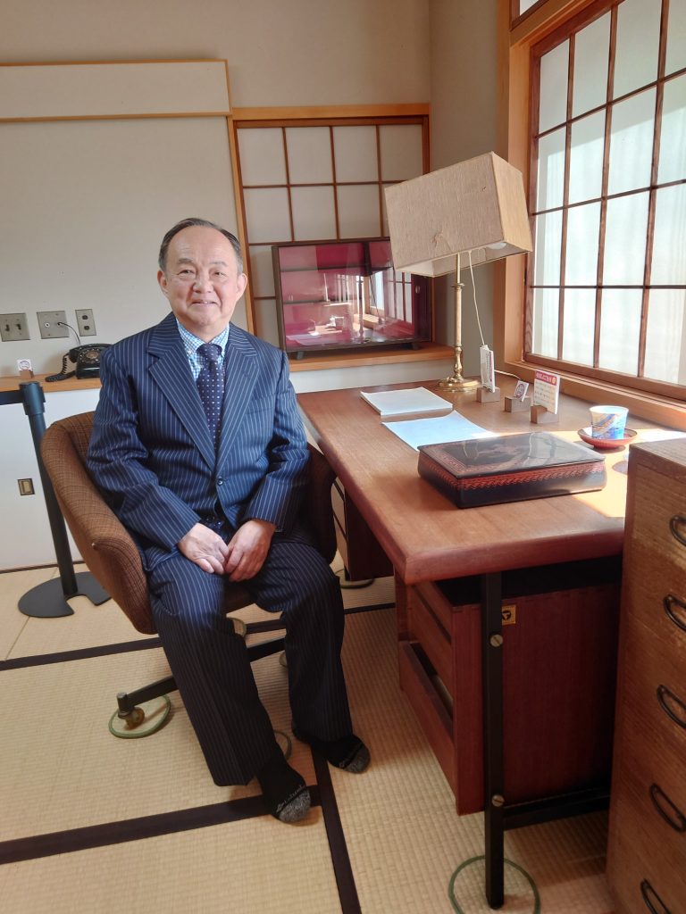 有吉先生の書斎で、有吉先生の机に向かって腰かけて記念撮影いたしました。私が来ているスーツは、前日の講演でもお話ししましたが有吉先生からのプレゼントです。