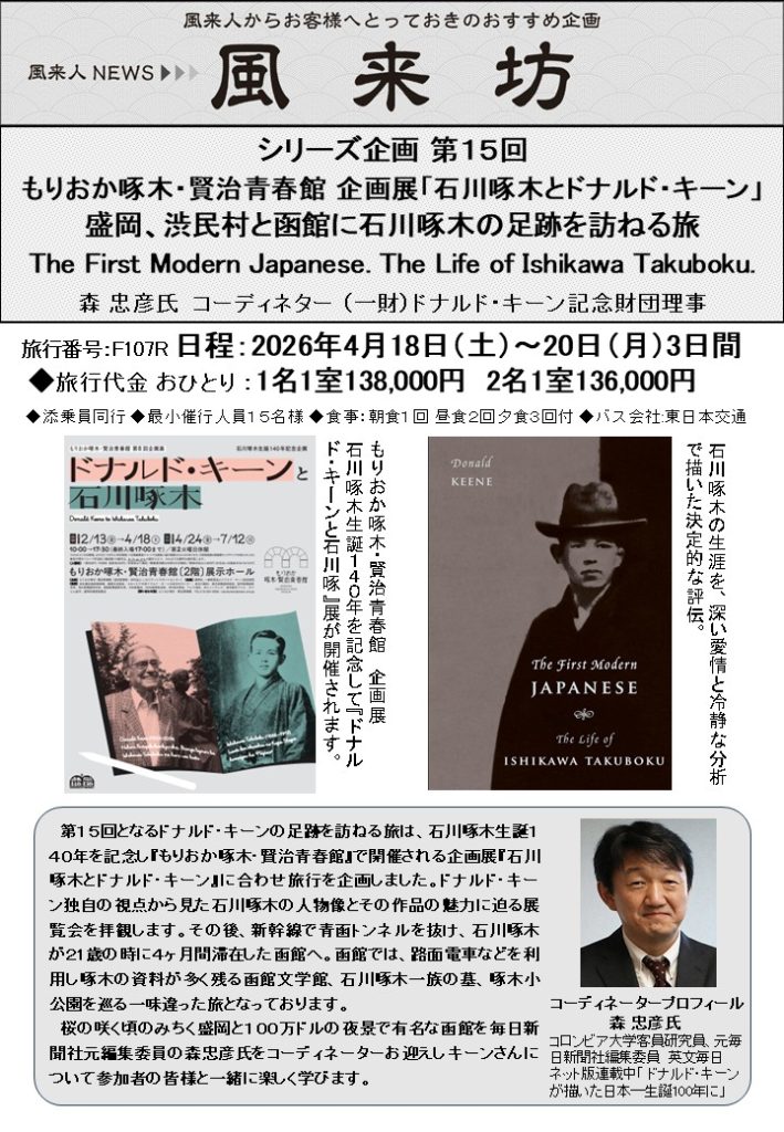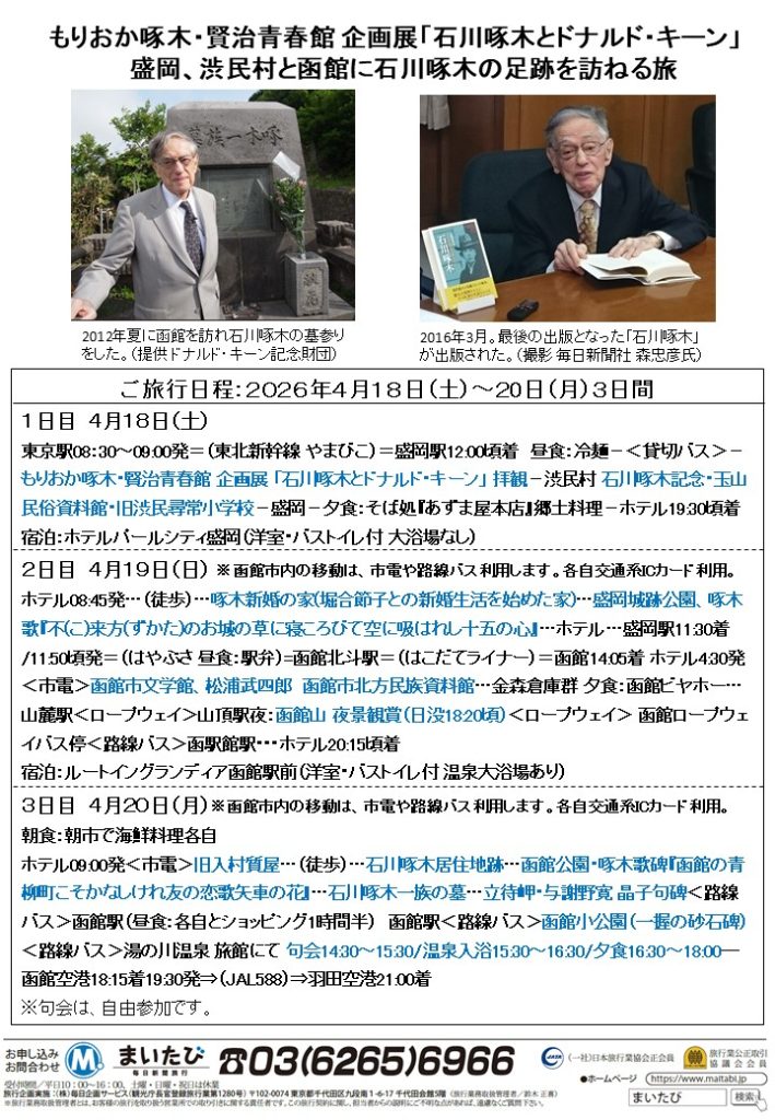 ドナルド・キーン記念財団の理事をおつとめいただいている森忠彦さんと毎日新聞旅行社による盛岡と函館ツアーが開催されます。今回もいつも同様楽しい旅になるでしょう。