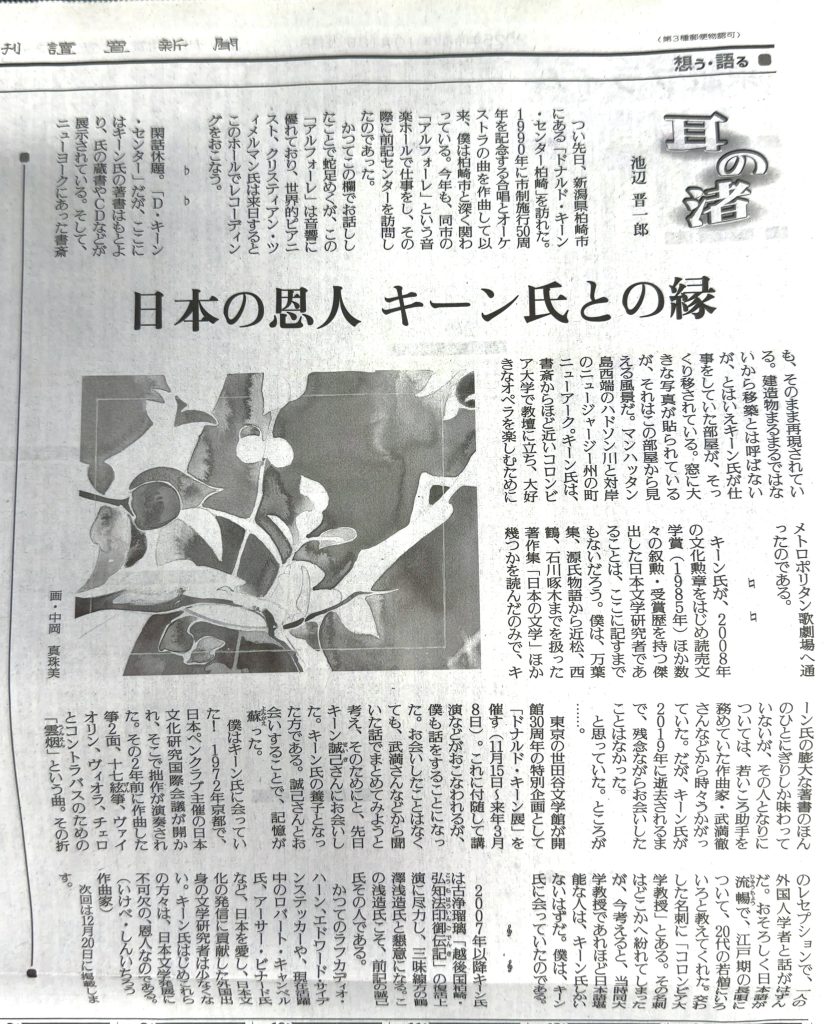 10月18日(土)読売新聞夕刊に作曲家・池辺普一郎先生の「耳の渚」という随筆ですが、「日本の恩人 キーン氏との縁」というとても素敵な文章を掲載して下さいました。